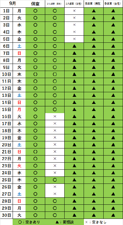 2025年9月のショートステイの空き状況について最新の情報をお知らせ致します。
