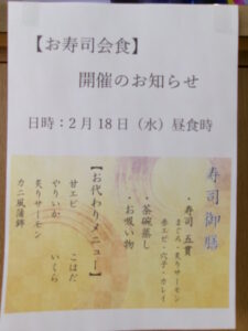 2月17日、18日は入所者様の食事イベントとして、お寿司会食を開催しました。